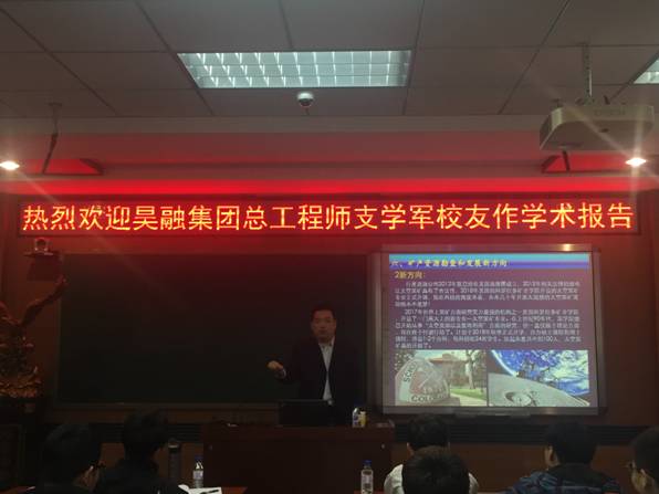 4月12日下午,学校邀请支学军校友返校为勘查与测绘工程学院资源勘查工程和地质学专业师生作了题为“新时代背景下地矿业的转变与发展机遇”的专题报告。支学军校友从地矿业发展状况、国际非油气矿产供需以及未来地质行业的发展方向等方面作了精彩的阐述。报告会精彩纷呈,气氛热烈。会上,支学军校友还与我校师生分享他在大学期间的记忆,回顾了难忘的大学时光。他结合了自身的成长经历勉励在校学生奋发图强,发挥个人潜能为母校争光。多年来,支学军校友始终心系母校,感恩母校,经常以实际行动支持母校的发展建设。