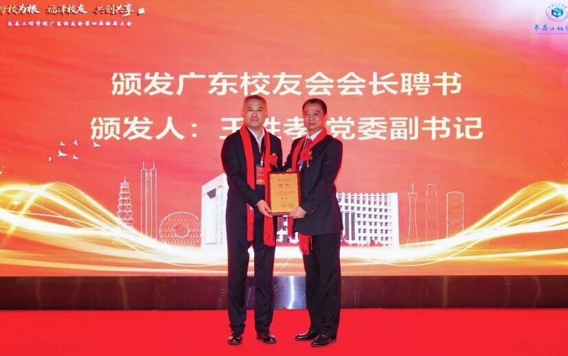 王胜孝副书记向广东校友会第四届理事会会长刘志坚校友颁发聘书并致辞。他代表母校和校友总会向广东校友会换届大会的顺利举行致以热烈祝贺,并提出三点希望:一是广聚校友,深植校友情怀,希望校友会打造成为在粤校友可信赖的温暖家园与精神港湾;二是优化服务,赋能校友成长,通过创新活动形式促进校友与母校间的深度交流与务实合作;三是传承精神,弘扬母校风采,讲好母校故事,提升母校声誉与影响力。