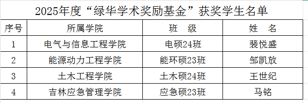 根据国务院《基金会管理条例》和《长春工程学院教育基金会章程》《长春工程学院“绿华学术奖励基金”评定办法》的有关规定,经本人申报、各学院初评和推荐、研究生工作处审核、现场答辩和专家评审,本着公开、公平、公正的原则,评选出裴悦盛等4名同学获得长春工程学院2025年度“绿华学术奖励基金”,现予以公示。